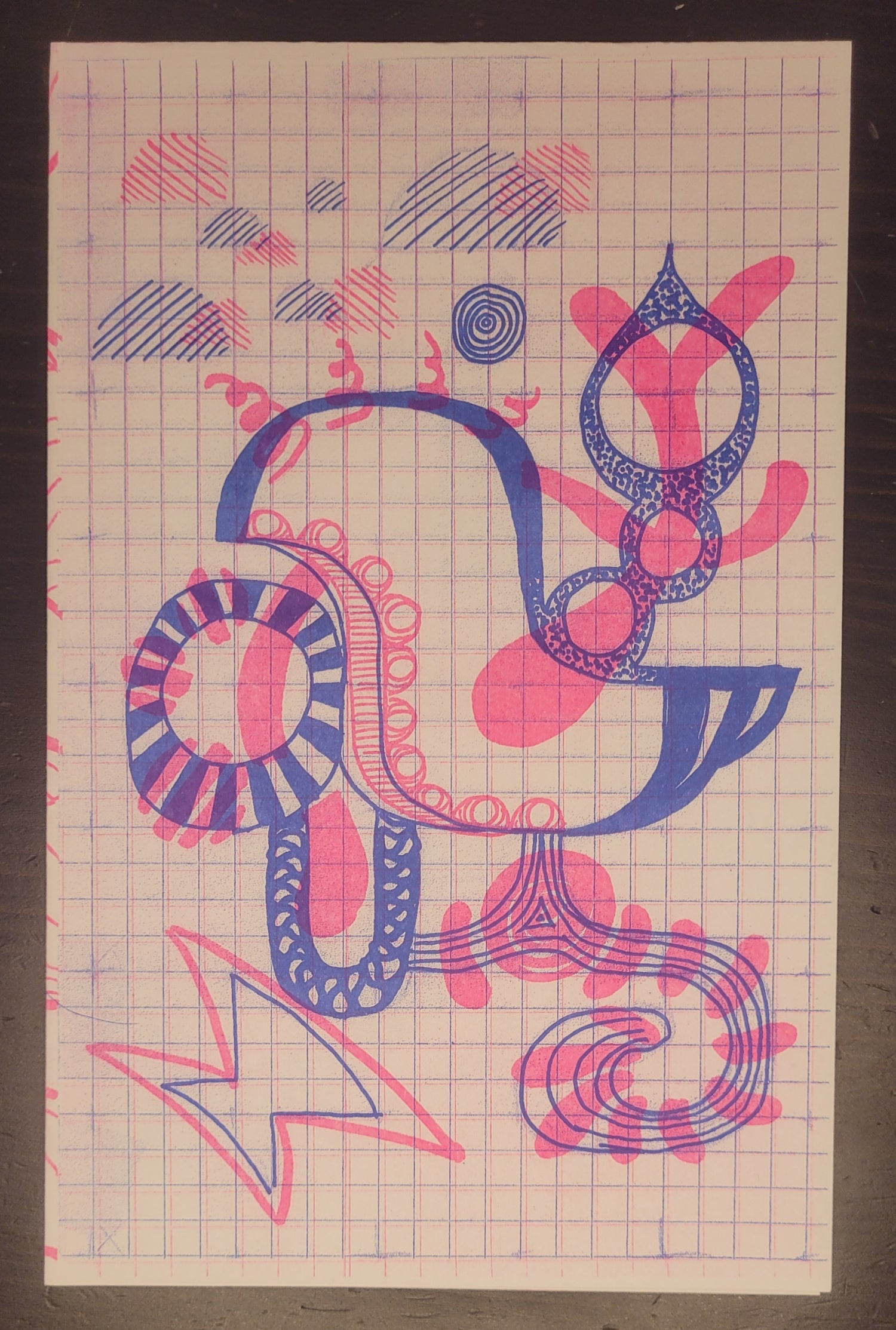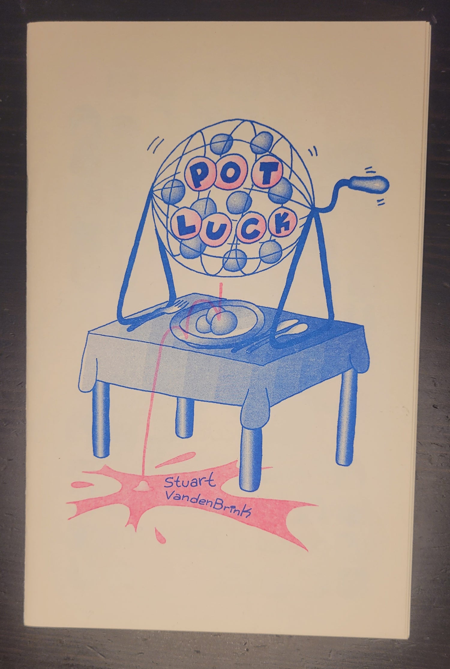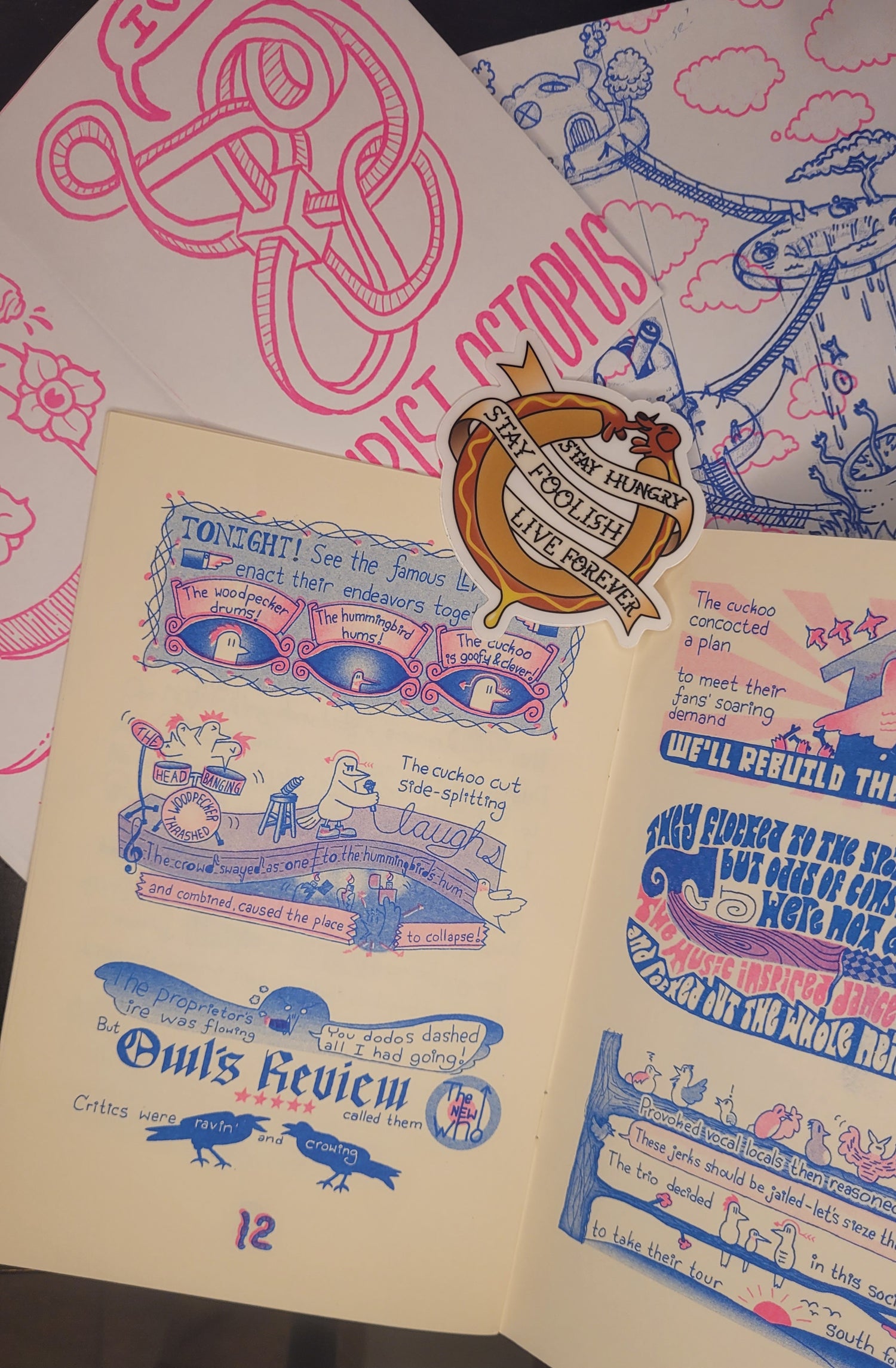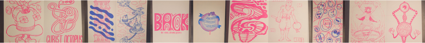 Stuart, Max, and Will make zines, which we print in-house on our rattly old Risograph. Sometimes we make stickers and pins, too!